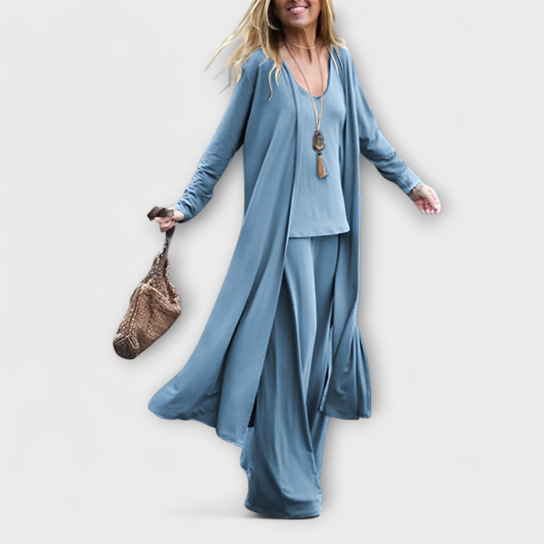 El conjunto de verano Ivonne combina un estilo moderno con una elegancia atemporal. Compuesto por tres piezas perfectamente coordinadas, te ofrece un look sin esfuerzo para los días cálidos, ya sea paseando por la ciudad, en una fiesta de verano o de viaje. Cómodo, femenino y versátil – un imprescindible para tu verano.